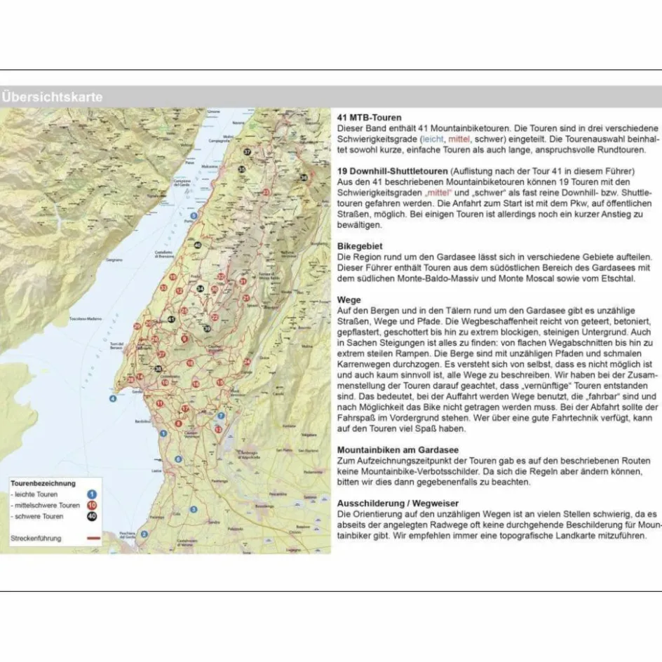 Die Mountainbike-Region „Gardasee Südost-Monte Baldo“ erstreckt sich von Malcesine im Norden bis nach Peschiera im Süden. Besonders der südliche Ausläufer des Monte Baldo Gebirgskammes bietet eine beeindruckende landschaftliche Vielfalt. Die Hochebene südlich von Caprino Veronese ist geprägt von sanften Hügeln, mediterranem Flair und dem Weinanbaugebiet rund um Bardolino. Aufgrund des milden mediterranen Klimas am Gardasee sind Touren ganzjährig möglich.Der Südosten des Gardasees ist als Mountainbike-Region nicht so bekannt und stark frequentiert, wie der nördliche Teil des Gardasees. Allerdings gibt es auch im Süden des Gardasees vielfältige Tourenmöglichkeiten, die von einfachen Touren auf wunderschön angelegten Radwegen bis hin zu extrem anspruchsvollen Singletrails reichen. In diesem Tourenführer werden die schönsten Mountainbike-Touren zwischen Malcesine, Peschiera, Garda, Affi und Ferrara Di Monte Baldo beschrieben.Die Biketouren werden jedem Anspruch gerecht, denn sowohl der ambitionierte Mountainbikerals auch der gemütliche Fahrer kann seine „Traumtour“ finden. „Bike Spaß pur…“Der Mountainbikeführer bietet Ihnen: . 41 Mountainbiketouren in den Schwierigkeitsgraden leicht, mittel, schwer. 6 Downhill-Shuttletouren in den Schwierigkeitsgraden mittel, schwer. benutzerfreundliches, kompaktes und stabiles Ringbuch im modernen Design. alle Touren auf faltbaren Tourenkarten zum Mitnehmen auf Tour. CD mit GPS-Tracks und KML Dateien zur Ansicht in Google Earth. Bike & Hike Tippsalle Touren mit: . farbiger Landkarte mit eingezeichnetem Routenverlauf, Orientierungspunkten und Trinkwasserbrunnen. exakt ausgearbeiteter Wegbeschreibung. genauen Kilometer- und Höhenangaben. detailliertem Höhenprofil mit Prozentangaben. vielen Landschaftsfotos und zusätzlichen Gebietsinfos