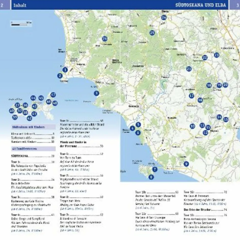 Das gibt es zu entdecken: Spannende Wanderrouten auf schmalen Pfaden mit Abenteuerfeeling zu Burgruinen und Höhlen, auf Berggipfel mit Weitblick, durch die finsteren Vie Cave der Etrusker und auf Küstenwegen mit gut versteckten Badebuchten.- Kinder-Infos zu Natur und Umwelt- Badeplätze, familiengeeignete Museen und Parks- Campingführer und Übernachtungstipps