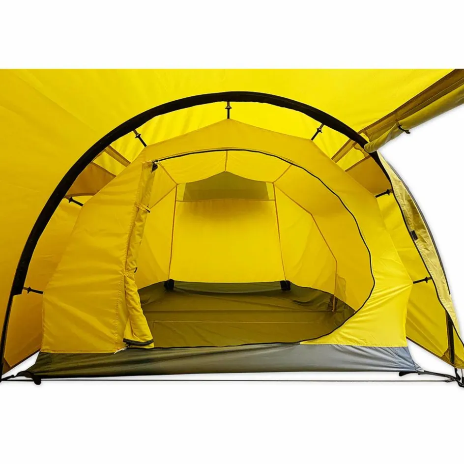 Mit seinem robusten, PU-beschichteten Außenmaterial sowie Seitenwänden, die bis auf den Boden heruntergezogen sind, schützt dich das Antao III zuverlässig vor Regen und Wind. Gleichzeitig hellt der gelbe Zeltstoff die Innenraum-Atmosphäre auf. Vier Belüftungsöffnungen lassen Luft im Inneren zirkulieren. So wird Kondensbildung minimiert und das Raumklima optimiert. In warmen Nächten kannst du den Eingang komplett hochrollen und nur mit der Moskitogaze verschließen.