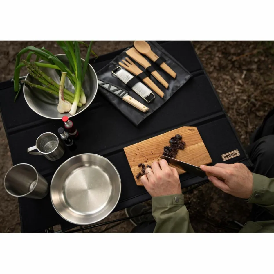 Alles am rechten Platz für die Outdoor-Küche! Diese schicke Tasche beinhaltet ein Küchenmesser, eine Reibe und Besteck: Koch-Spatel, Koch-Löffel und -Gabel sind aus robustem Eichenholz gearbeitet.