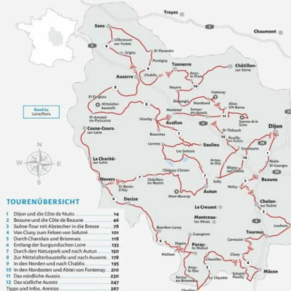 Tourenkarten: Folgen Sie uns auf 12 sorgfältig recherchierten Touren durch die schönsten und interessantesten Gebiet des Burgund. Orientieren Sie sich mit Übersichtskarten zu allen Stell- und Campingplätzen, Ver-und Entsorgungsstationen und den empfohlenen Reiserouten.