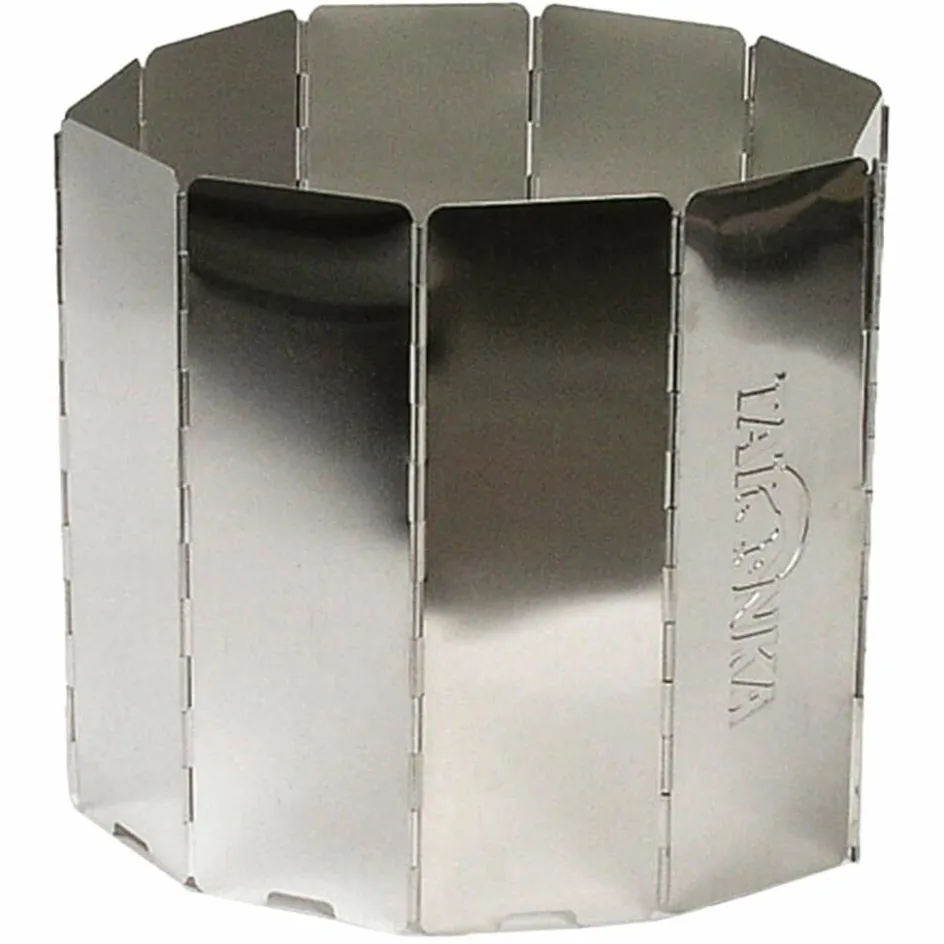 Windschutz für Spirituskocher und kleinere Kochstellen aus Aluminium; mit 10 Gliedern. Bei Wind und um die Leistung des Kochers zu verbessern, wird der Faltwindschutz um den Kocher herumgefaltet und mit zwei Schiebern im Boden verankert.
