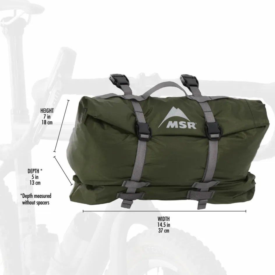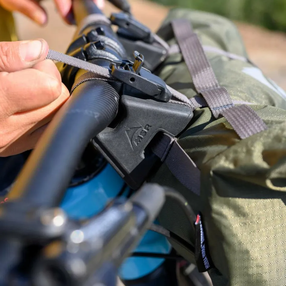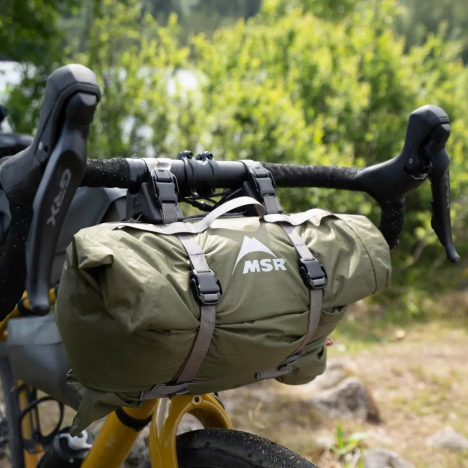 MSR hat dem Packsack besondere Aufmerksamkeit gewidmet. Dieser verfügt über einen Rollverschluss, der es ermöglicht, das Zelt stark zu komprimieren. Zwei Gurte und Halterungsblöcke erlauben eine direkte Befestigung am Lenker, was für einen sicheren Halt sorgt und den Kauf einer Lenkertasche überflüssig macht. Weitere Schlaufen am Packsack bieten die Möglichkeit, zusätzliche Ausrüstung zu befestigen.