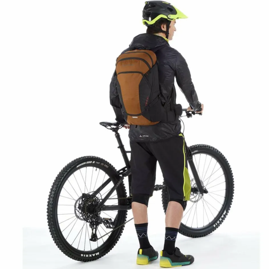 Das große, aufgesetzte Frontfach hält zahlreiche Taschen zur Organisation von Werkzeug, Ersatzschlauch und Pumpe bereit. Im oberen Frontfach lassen sich Geldbeutel und Schlüssel sicher in der innenliegenden Netztasche verstauen. Weitere Netztaschen befinden sich seitlich und auf dem rechten Hüftflügel. Eine abnehmbare Regenhülle und eine flexible Helmhalterung, mit der sich auch Full Face Helme transportieren lassen, sind inklusive. Beide lassen sich schnell im Bodenfach verstauen.