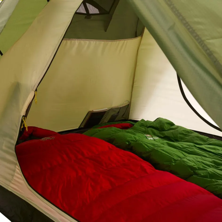 Das Innenzelt ist für zwei Personen großzügig geschnitten. Mit einer Höhe von 105 cm kannst du bequem sitzen und auch das Anziehen am Morgen ist ohne große Verrenkungen möglich. In den vier Seitentaschen lassen sich Bücher, Stirnlampe, Mobiltelefon u. Ä. griffbereit aufbewahren. Der Innenzelteingang ist mit einem Moskitonetz ausgestattet und kann bei Bedarf mit Stoff verschlossen werden. Damit du nicht jedes Mal den Eingang aufrollen musst, befinden sich zwei zusätzliche Netztaschen neben der Tür, in der sich die Türen unkompliziert verstauen lassen.