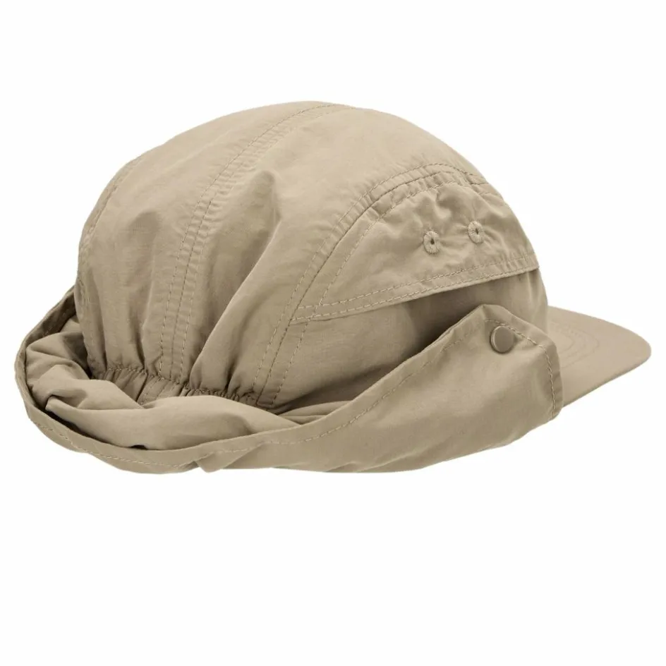 Der Nackenschutz lässt sich zusammenrollen und mit Druckknöpfen fixieren. So entsteht eine lässige Cap, die problemlos ins Handgepäck passt. Den richtigen Sitz erhält die Kopfbedeckung durch ein elastisches Gummiband am Hinterkopf.