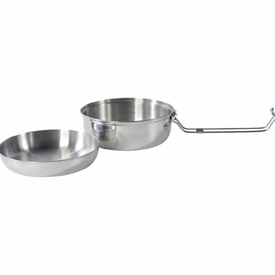 Kochset mit 1,5 Liter Volumen und klappbarem Griff. Für Trekking und Camping. Das Camping-Kochset besteht aus einem Topf mit Deckel und ist mit einem Bügelverschluss fest zu verschließen. Ausgeklappt dient der Verschluss als Griff für den Topf. Die Teile können auch als Schüssel und Teller verwendet werden. Der Topf fasst 1,5 Liter. Das Camping-Geschirr-Set aus rostfreiem 18/8 Edelstahl ist lebensmittelecht, leicht zu reinigen und unzerbrechlich.