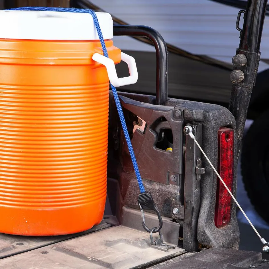 Der Sidelock Carabiner Bungee besteht aus einem elastischen Band und zwei Karabinern, dessen Öffnungen mit einer Schiebeverriegelung gesichert werden können.