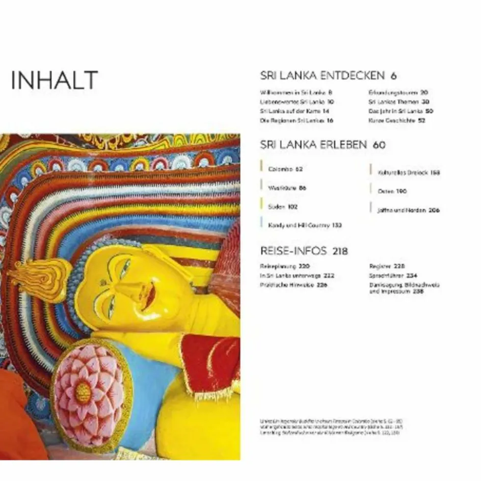 Sri Lanka wartet auf Sie: Lassen Sie sich mit dem praktischen und informativen Reiseführer zu den schönsten Erlebnissen, Attraktionen und Sehenswürdigkeiten Sri Lankas führen – ob Sie den heiligen Zahntempel in Kandy besichtigen, sich von der Railway Line durch die Hügellandschaft kutschieren lassen oder sich einen köstlichen Tee in der Teefabrik von Newburgh gönnen. . Die schönsten Orte: Die fabelhaftesten Gegenden stellen sich Ihnen im Reiseführer Sri Lanka Region für Region in ihrer gesamten Pracht vor – mit fundierten und qualitativen Inhalten sowie unvergesslichen Highlights aus Kultur und Alltag. Von Colombo bis Kandy, von Jaffna bis Galle. . Das Beste für Ihre Reise nach Sri Lanka: Sieben Tage, zwei Wochen oder länger – ein Urlaub auf Sri Lanka lohnt sich! Ob wenig oder viel Zeit, um die Insel zu erkunden, es gibt facettenreiche Vorschläge, um das Beste aus Ihrem Trip herauszuholen. So besuchen Sie bei einer zweiwöchigen Tour durch Sri Lanka unter anderem die Hauptstadt Kandy, schlendern durch den königlichen botanischen Garten von Peradeniya, erkunden das Aluvihare Kloster, machen eine Radtour durch Polonnaruwa und beobachten Leoparden auf einer Safaritour in Yala. . Handgezeichnete 3-D-Aufrisszeichnungen: Sensationelle 3-D-Aufrisszeichnungen zeigen jedes Detail verschiedener Stadtteile und Bauwerke aus der Vogelperspektive und bieten ganz neue und einmalige Einblicke in die Sehenswürdigkeiten – beispielsweise in den heiligen Zahntempel in Kandy, mit einer der wichtigsten Reliquien der Buddhisten. . Ausgewählte Top-Themen: Auf den bildgewaltigen Themenseiten des Sri Lanka Reiseführers stehen charakteristische Besonderheiten im Fokus. Erkunden Sie die atemberaubenden Strände, Tierwelt, Zugfahrten, Wassersport-Möglichkeiten und die schönsten Fotomotive für Fotofans in Sri Lankas. Auch Outdoor-Abenteuer-Fans, Foodies, Sport-Enthusiasten sowie Architektur-Begeisterte kommen hier auf ihre Kosten. . Unvergessliche Spaziergänge: Entlang der beeindruckendsten Sehenswürdigkeiten Sri Lankas spazieren und dabei alles Wichtige über Kirchen, Monumente, Museen oder Plätze erfahren: Handgezeichnete Spaziergänge nehmen Sie mit auf eine erlebnisreiche Route – zum Beispiel durch die Hauptstadt Colombo und das alte holländische Viertel in Galle, wo unter anderem beeindruckende Tempel stehen. . Inspirierende Fotografien: Ob majestätische antike Monumente, beeindruckende Naturgebiete, traumhafte Küsten und Strände oder aufregende Wildtiere: Atmosphärische Sehnsuchtsbilder wecken Ihr Fernweh!