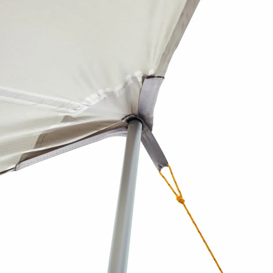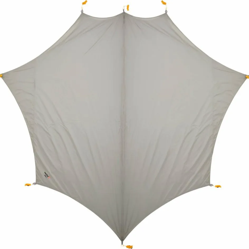 Durch den Minimalflächenschnitt kannst du es straff abspannen. Das funktioniert nahezu überall mit separat erhältlichen Tarpstangen, aber auch mithilfe von Bäumen.