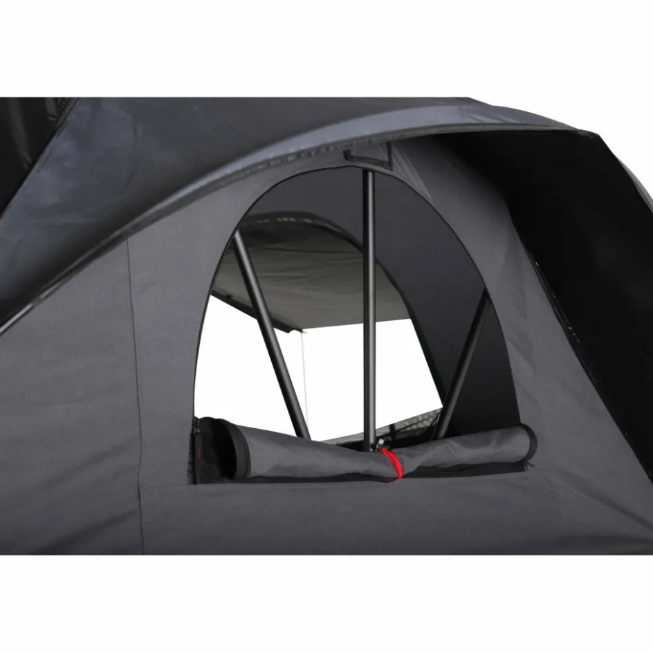 Mit seinen insgesamt vier Fenstern plus einem Dachfenster wird ein helles, angenehmes Ambiente und Raumgefühl geschaffen. Das wasserdichte Überzelt mit abgedichteten Reißverschlüssen sowie die Überdachungen an den Fenstern schaffen Sicherheit bei Schmuddelwetter. Als Material am Zelt kommt zudem ein Baumwollmischgewebe zum Einsatz. Sein Vorteil: kaum Kondensbildung und ein angenehmes Klima im Zelt, selbst bei hohen Temperaturen.