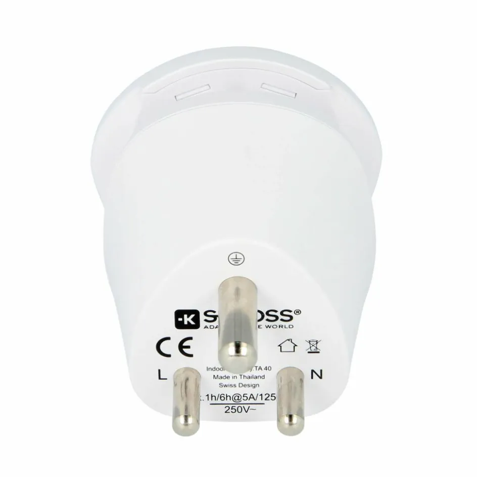Dieser Reisestecker bietet einen Ausgang für Stecker aus Europa (Schuko) und Indien und eignet sich auch zum Betreiben von Notebooks und Föns.