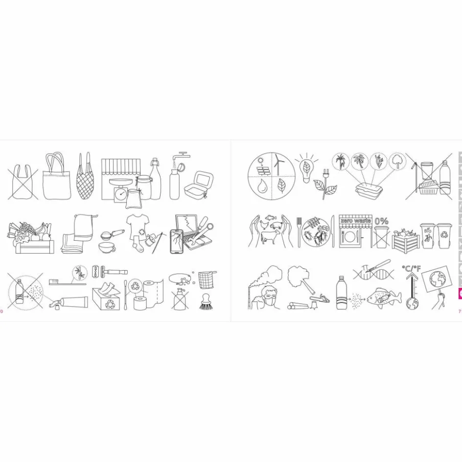 Die Druckfarben sind mineralöl- und kobaltfrei. Die Folienkaschierung ist restlos kompostierbar. Inhaltlich enthält es viele neue Icons zu Umwelt- und Klimaschutz – so z.B. ein Symbol für „unverpackt einkaufen“ oder „zero waste“.