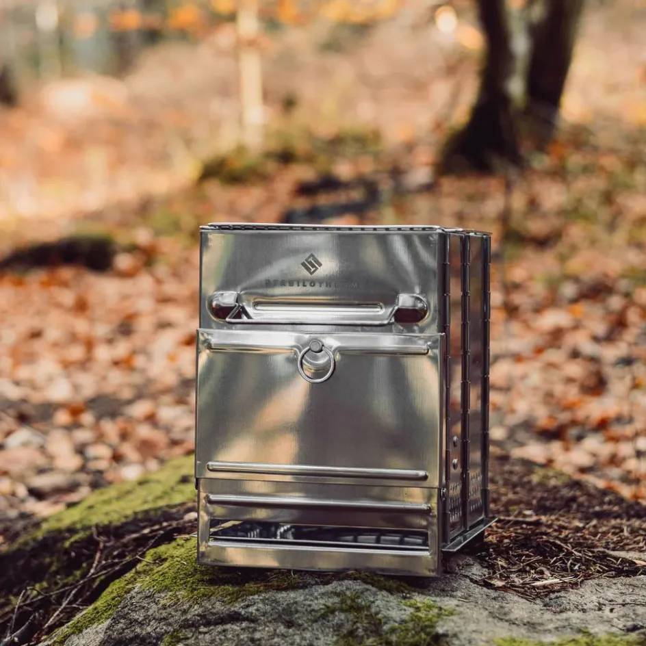 Besonders großer Holzkocher, der sich platzsparend zusammenfalten lässt und damit gut für Roadtrips eignet. Auf ihm lassen sich in Eisenpfannen und Kesseln Gerichte für mehrere Personen zubereiten.