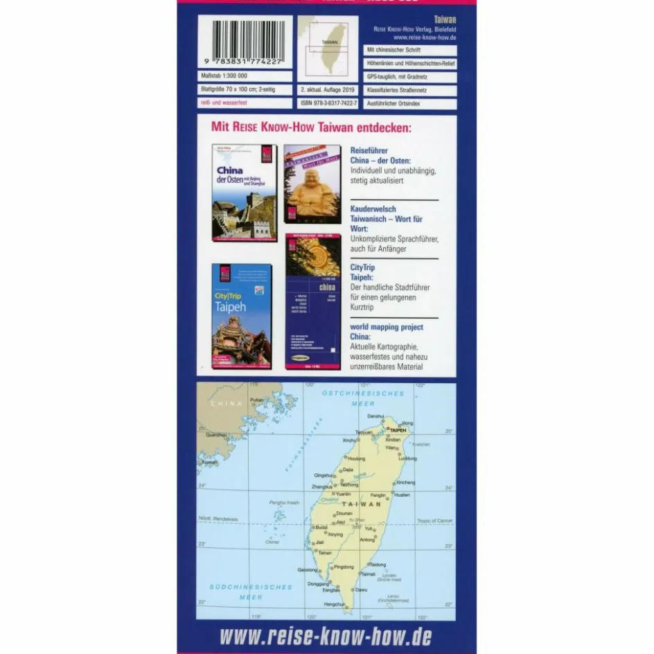 Hochreißfeste und 100% wasserfeste Landkarte „Taiwan“ aus der Serie world mapping project, erschienen im Reise Know-How Verlag.Reise Know-How Landkarten zeichnen sich durch besonders stabiles Kunststoffpapier aus, das beschreibbar ist wie Papier, sogar mit Bleistift. Der Pappumschlag ist abnehmbar, so dass sich die Karte bequem in jede Tasche stecken lässt. Eine Schutzhülle ist nicht erforderlich. Die kartografische Darstellung konzentriert sich auf die wichtigsten Informationen für Reisende und ist besonders gut lesbar. Statt einer Schummerung werden farbige Höhenschichten verwendet.Ausstattung: – Höhenlinien mit Höhenangaben; – Farbige Höhenschichten; – Klassifiziertes Straßennetz mit Entfernungsangaben; – Sehenswürdigkeiten; – Ausführlicher Ortsindex; – GPS-genau; – Längen- und Breitengrade; – Viersprachige Legende (deutsch, englisch, französisch, spanisch); – Alle Orte auch in chinesischer Schrift; – Übersichtskarte auf dem Umschlag. Handliches Format: 70×100 cm, 2-seitig bedruckt.