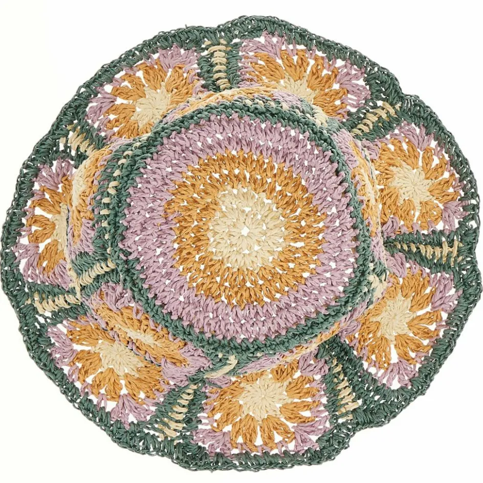Der trendige Sommerhut wirkt auf den ersten Blick wie gehäkelt, bei genauer Betrachtung erkannt man die durch sein spezielles Material entstandene Strohhaptik. Hierdurch erhält der Hut einen festen Griff, welcher durch einen Draht in der ca. 8 cm breiten Krempe unterstützt wird. Ein umlaufendes Stoffband im Inneren sorgt für bequemen Sitz. Dieser lässt sich dank eines verdeckten Klettbands auch noch ein wenig anpassen. Durch das Blumenmuster in sommerliche Farben erhält der Hut einen tollen Retro-Charm.