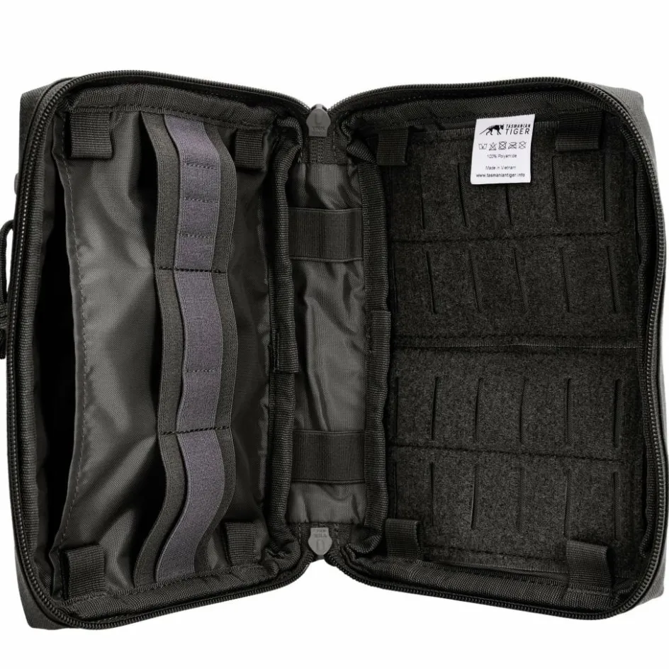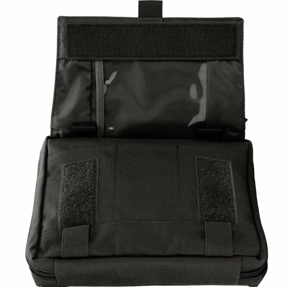 Die Zubehörtasche ist aus kräftigem Cordura gearbeitet, um auch höchsten Belastungen standzuhalten. In den Steckfächern unter dem Deckel lassen sich Multitools und ähnliche Ausrüstungsteile für den schnellen Zugriff verstauen. Für lose Teile gibt es ein RV-Fach im Deckel. Das Hauptfach lässt sich weit aufklappen und ist ausgestattet mit zahlreichen elastischen Steckschlaufen und einer großen MOLLE-Klettfläche.