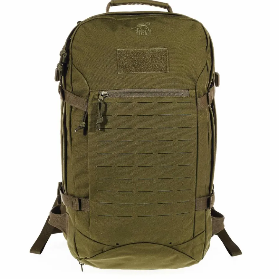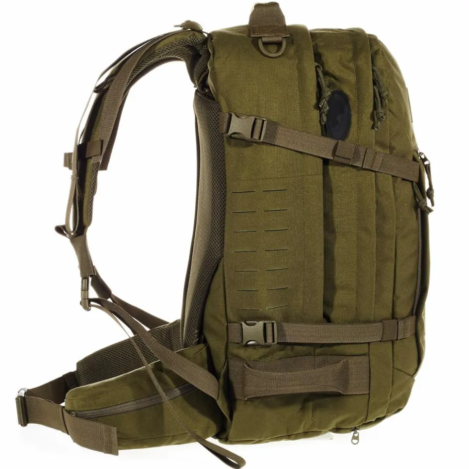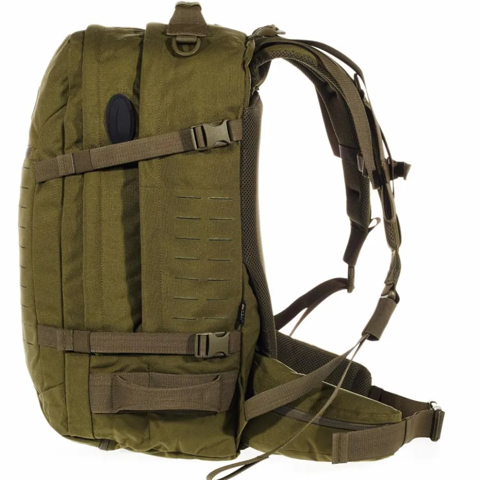 Extrem robuster, modularer Rucksack aus Cordura–Nylon, den du dir ganz nach deinen Vorlieben ausstatten kannst: Vorne und an den Seiten sind MOLLE-Laschen in Laser-Cut-Ausführung eingearbeitet.