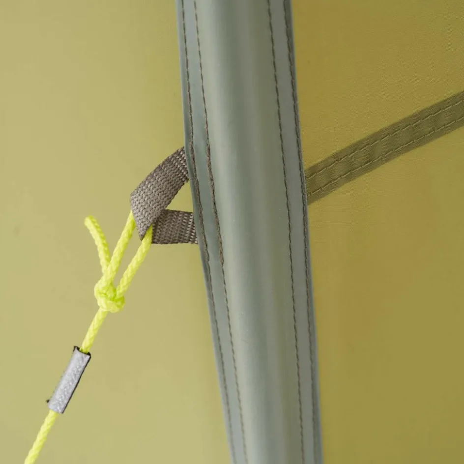 Das Außenzelt wird mit vier unterschiedlich langen Gestängebögen aufgestellt. Da das Innenzelt eingeknüpft bleiben kann, ist das Zelt direkt nach dem Abspannen bezugsfertig. Das vierfach PU-beschichtete Außenzelt weist eine Wassersäule von 8.000 mm auf und ist UV-beständig sowie farbecht. Der Innenzeltboden erreicht sogar eine Wassersäule von 10.000 mm!