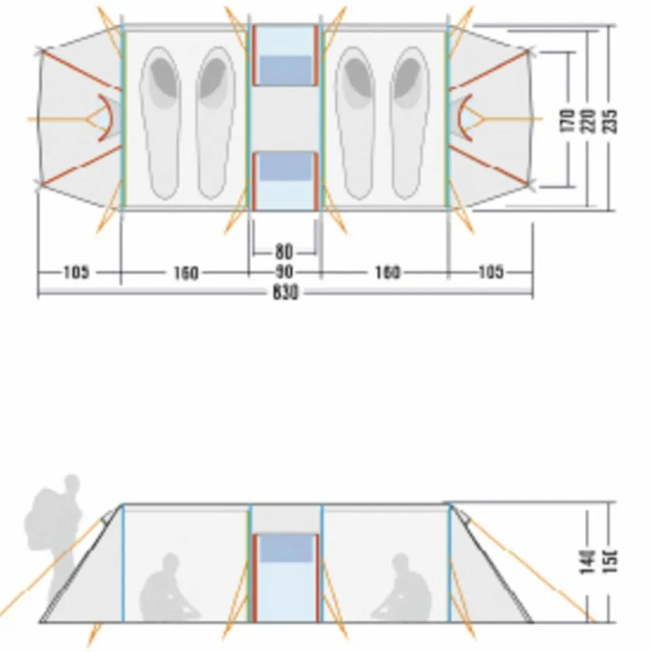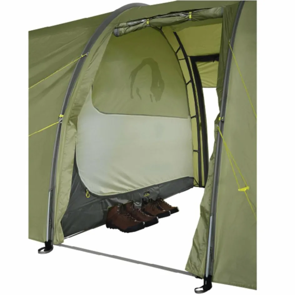 Das 4-Personen-Zelt Alaska Family DLX von Tatonka verfügt über zwei geräumige Schlafkabinen für vier bis maximal sechs Personen. In den Apsiden an beiden Längsseiten sowie in der zentralen Apsis in der Mitte steht viel Platz für die Ausrüstung zur Verfügung. Sowohl der Zelteingang in der Mitte als auch die Apsiden an den Seiten ermöglichen den Zugang zu den Innenzelten. Dank der Tunnelkonstruktion und einer Höhe von 1,40 bzw. 1,50 Metern in der Mitte, wird der Raum optimal genutzt.