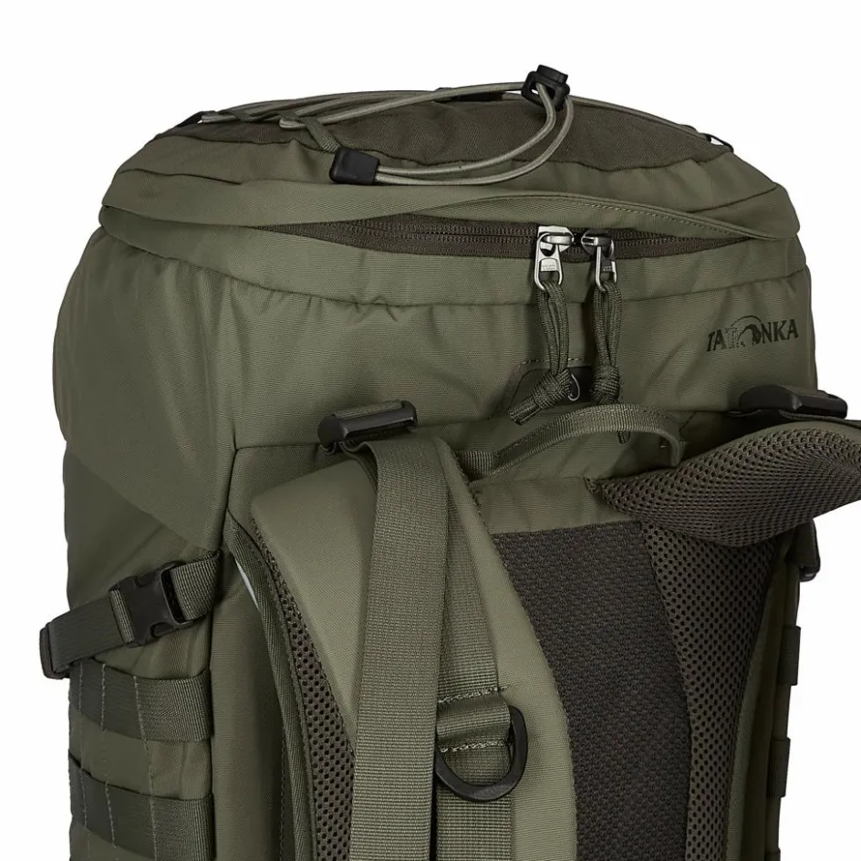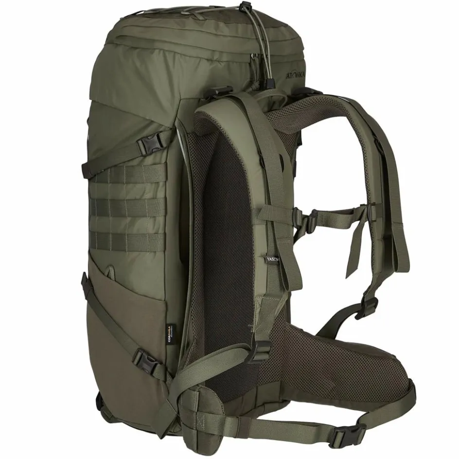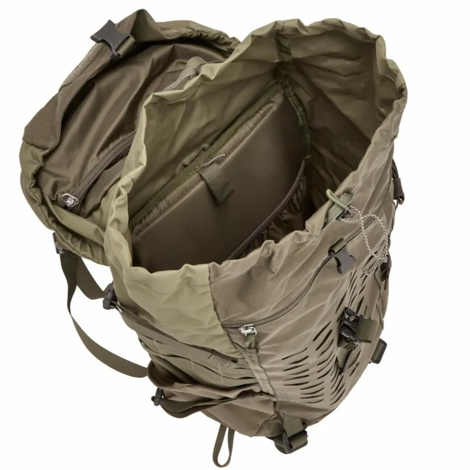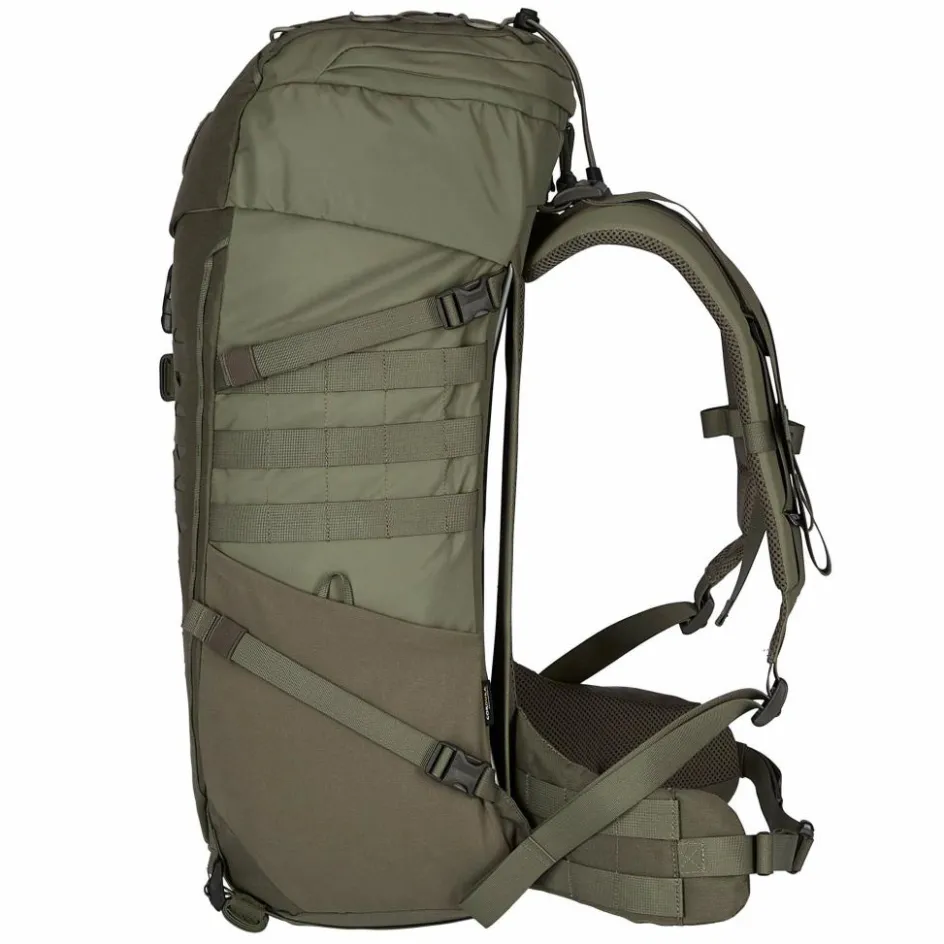 Die klassischen Rucksackfächer bringt der Tourenrucksack natürlich ebenfalls mit: Zwei RV-Fächer im Deckel, zwei Steckfächer an den Seiten, ein großes Steckfach auf der Front und ein RV-Fach auf dem Hüftgurt – mehr als genug Platz um Wasserflasche, Poncho und Co. übersichtlich unterzubringen. Für deine Wanderstöcke gibt es eine seitlich platzierte Schlaufe und die Isomatte ist dank zweier Riemen am Boden ebenfalls sicher verstaut. So lässt der Bushcraft-Spezialist sich auch wunderbar für herkömmliche Wandertouren nutzen.