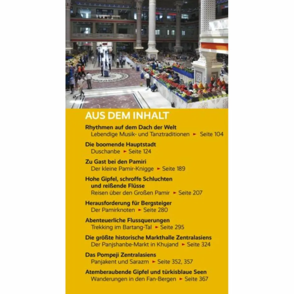 Auch kulturell hat das kleine Land viel zu bieten. So kann man auf den Spuren vorchristlicher Kulturen, des Buddhismus und des Islam reisen. Überall wird der Reisende auf herzliche Gastfreundschaft und ein kleines Abenteuer treffen.Dieser Reiseführer gibt zahlreiche Hinweise zur Vorbereitung einer unvergesslichen Reise. Detaillierte Tipps zu Unterkünften, Routen und Reisemöglichkeiten im Land ermöglichen einen besonderen und individuellen Aufenthalt, ausführliche Informationen zu Geschichte und Lebensweise geben einen tiefen Einblick in die tadschikische Kultur.