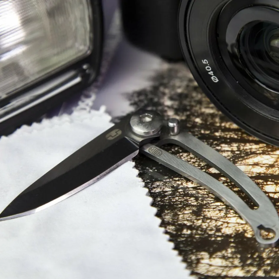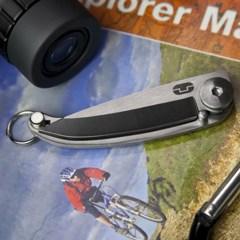 Die schwarz-titanbeschichtete Klinge besteht aus 420er Edelstahl und bietet eine gute Balance zwischen Härte und Korrosionsbeständigkeit. Ein Klingenstift mit Schnellverschluss schützt zuverlässig, wenn das Messer nicht im Einsatz ist. Durch die große Aussparung im Griff wird Gewicht eingespart und gleichzeitig das minimalistische Design hervorgehoben. Der integrierte Schlüsselanhänger rundet das Messer ab und macht es zu einem ständigen Begleiter.