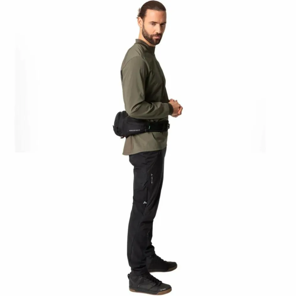 Das hintere Fach bietet über die komplette Breite genügend Platz für Regenjacke und Ersatzschlauch. 2 kleine, mit Reißverschluss verschlossene Seitentaschen schmiegen sich perfekt um den Hüftbereich und verwahren Minitool, Handy oder Riegel. Ein auf die Front aufgesetztes Fach ermöglicht gute Organisation des Werkzeugs. Am Boden der sportlichen Hüfttasche lassen sich sowohl eine Minipumpe als auch vor der Ausfahrt Protektoren befestigen. Eine Regenhülle für Schutz vor Schauern und Schmutz sowie ein reflektierender Webbingloop und das reflektierende Vaude Logo runden dieses Komfortpaket mit 3 l Volumen ab.