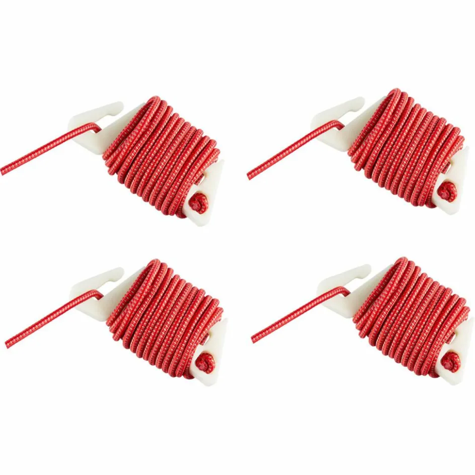 Vier Zeltleinen mit praktischen Leinenspannern, bei denen die Leine zum Transport um den Spanner gewickelt und das lose Ende eingehakt werden kann. So verknotet sich nichts im Gepäck.