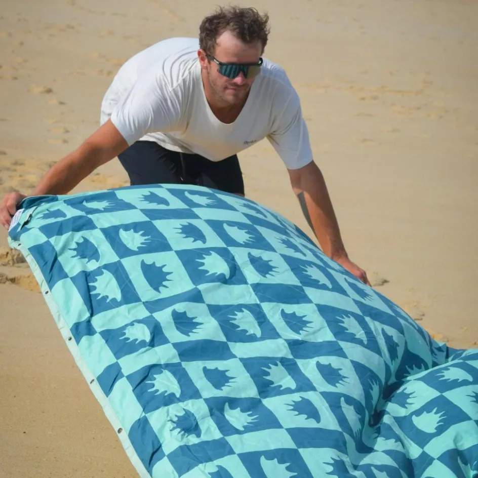 Die Voited Picnic Blanket verfügt über seitliche Druckknöpfe, mit denen du mehrere Decken miteinander verbinden kannst. Alternativ lässt sich die Decke auch mit der gegenüberliegenden Seite zusammenknöpfen und überwerfen. So entsteht entweder ein Sichtschutz zum Umziehen oder ein regendichtes Cape, das dich trocken vom Strand nach Hause bringt.