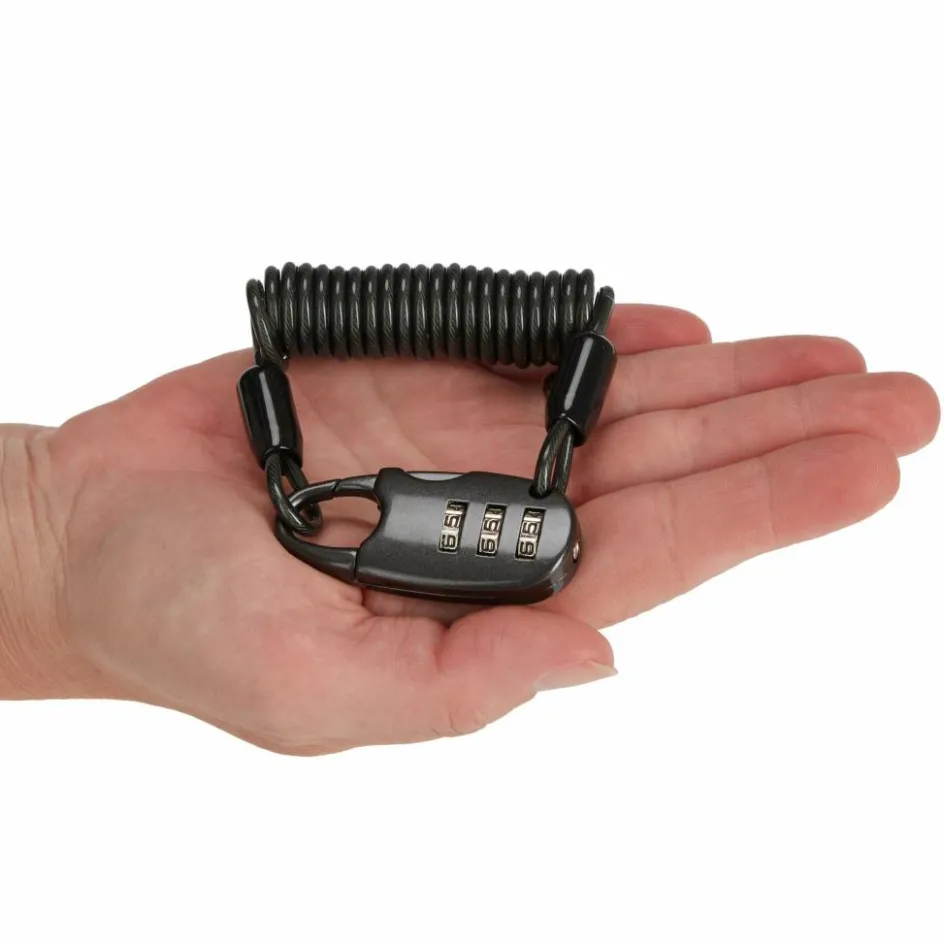 Du kannst es mit einem frei wählbaren, 3-stelligen Zahlencode belegen. Mit einer maximalen Länge von 120 cm kannst du das Kabel gut durch alle zu sichernden Punkte fädeln; in ungedehntem Zustand ist das Schloss hingegen ganz klein und kompakt und passt einfach in die Hosentasche. Einfach, praktisch und gut für einen Basis-Diebstahlschutz!