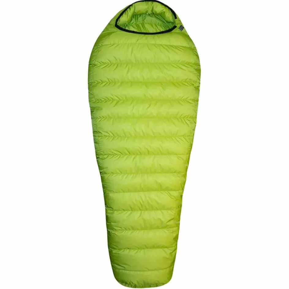 Zwischen der oberen und unteren Daunenkammer gibt es keine Barriere. Du kannst die Wärmeleistung des Schlafsacks ganz einfach selbst anpassen, indem du den Reißverschluss vollständig öffnest. Anschließend schüttelst du die Daunen in milden Nächten auf die Rückseite. In kalten Nächten schüttelst du sie dagegen auf die Oberseite, um eine höhere Isolierleistung zu erzielen. Voraussetzung dafür ist lediglich eine gut isolierende Isomatte, damit der Rücken nicht auskühlt.