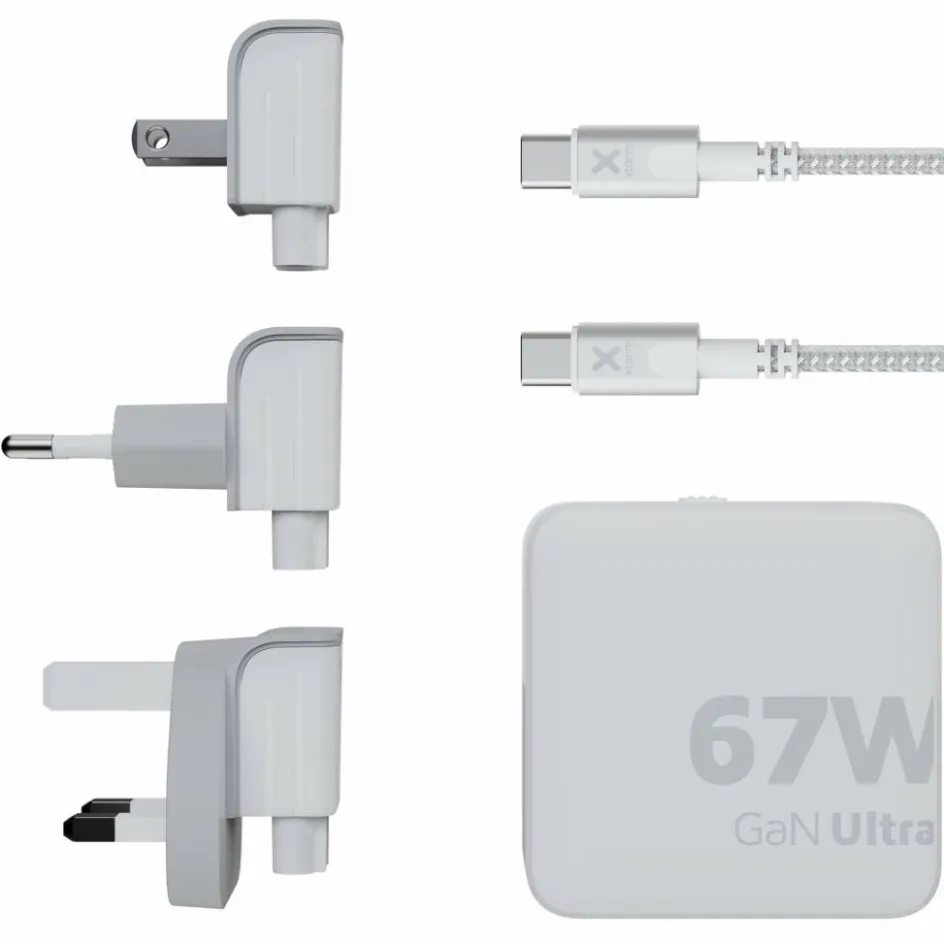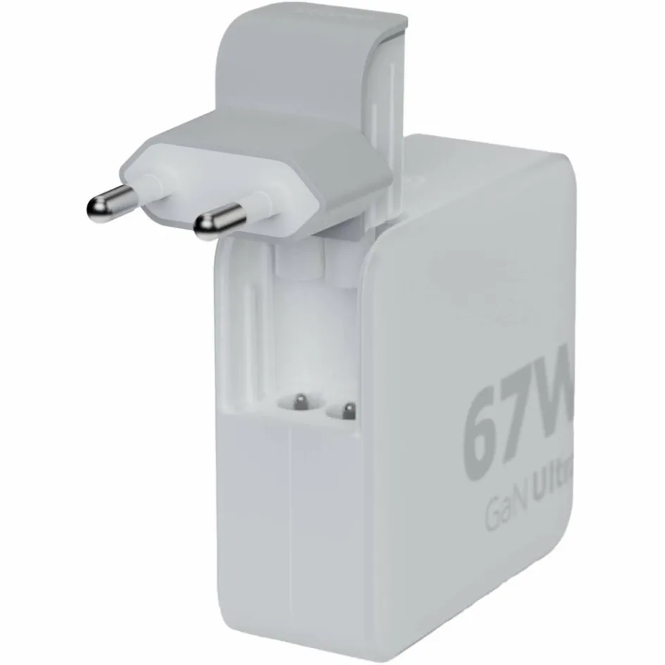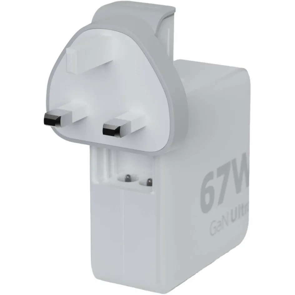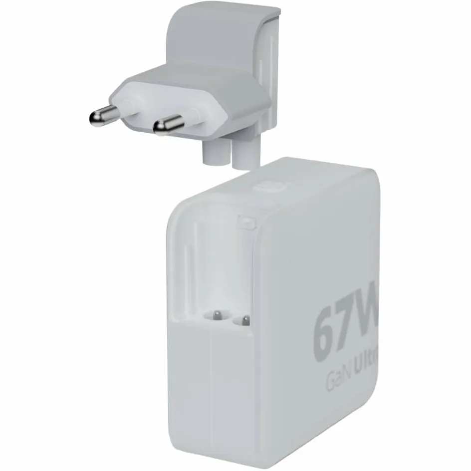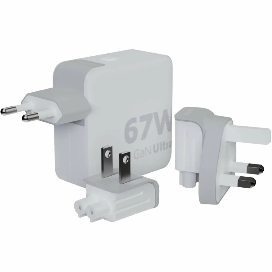 Der Adapter verfügt über zwei USB-C-Anschlüsse mit 20W und 67W. Dadurch kannst du unterwegs neben deinem Notebook gleichzeitig auch dein Smartphone oder Tablet aufladen. Der EU-Stecker kann werkzeugfrei gegen den beiliegenden US- oder UK-Stecker getauscht werden.
