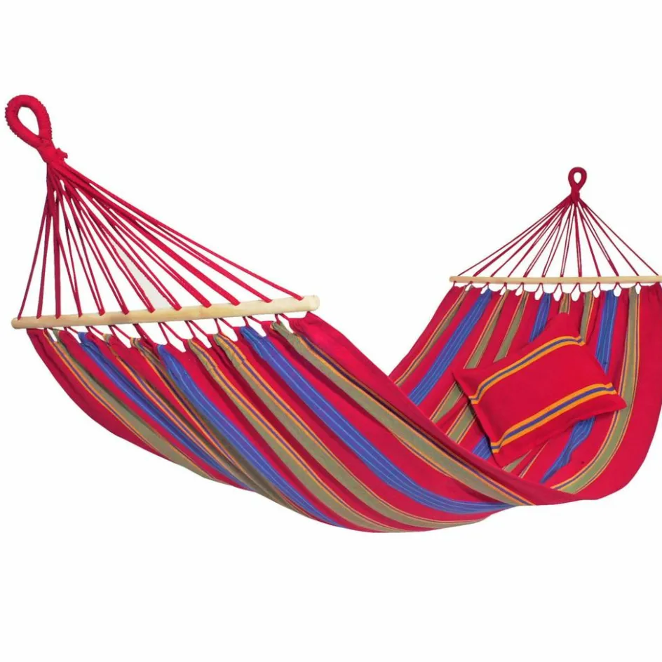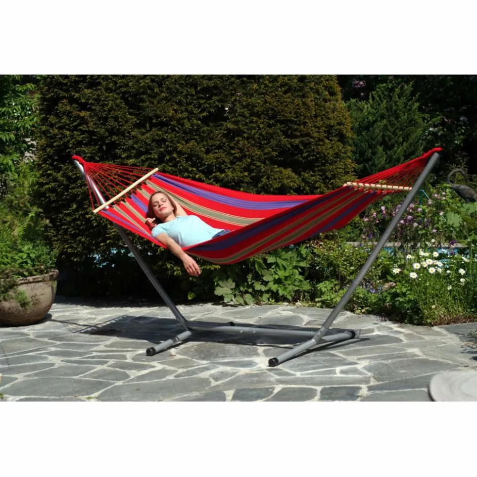 Das Material ist baumwollweich, dabei aber fast zur Hälfte aus Polyester. Das verleiht dem Elltex-Material (Elltex steht für Extra Long Lasting Textile) eine hohe Wetterbeständigkeit und Robustheit. Die Spreizstäbe an Kopf- und Fußende dieser robusten Hängematte sorgen für eine wunderbare Wölbung – und damit für einen hohen Liegekomfort. Außerdem sind Hängematten mit solchen Hartholz-Stäben auch kippsicherer als Hängematten ohne. Gerade mit Kindern ein weiteres Argument für die Aruba. Durch die Breite von 120 cm kannst du auch in dieser Hängematte den Amazonas-typischen, beinahe schwerelosen Liege-Komfort genießen.