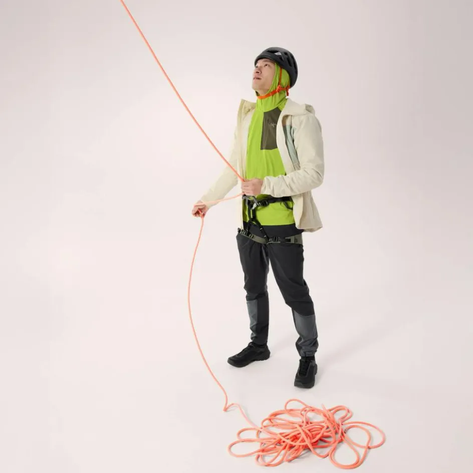 Die eng anliegende Kapuze lässt sich problemlos unter dem Kletterhelm tragen. Abgerundet wird das Ganze durch zwei Einschubtaschen und eine Brusttasche, in denen du Energieriegel oder Topo direkt griffbereit am Körper tragen kannst.