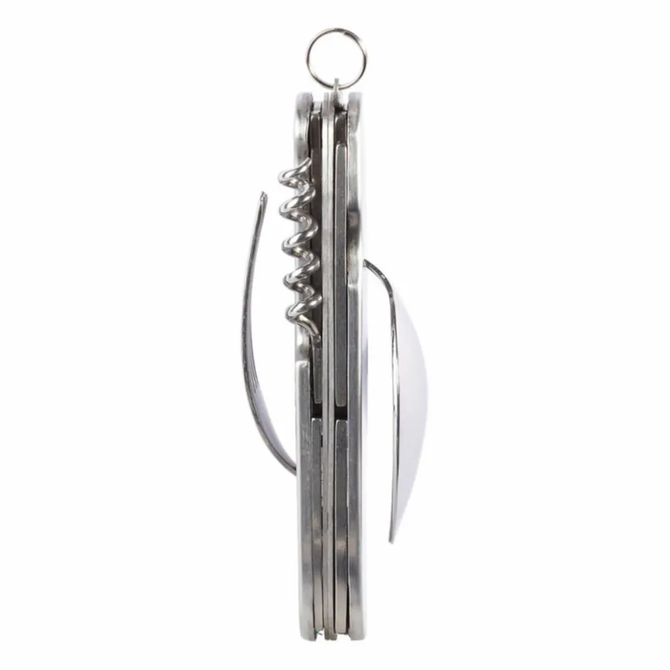 Set aus Messer, Löffel, Gabel, Dosenöffner, Korkenzieher und Ahle. Die beiden Schalen lassen sich entriegeln und so in Messer, Löffel und Ahle auf der einen, den Rest auf der anderen Seite teilen.