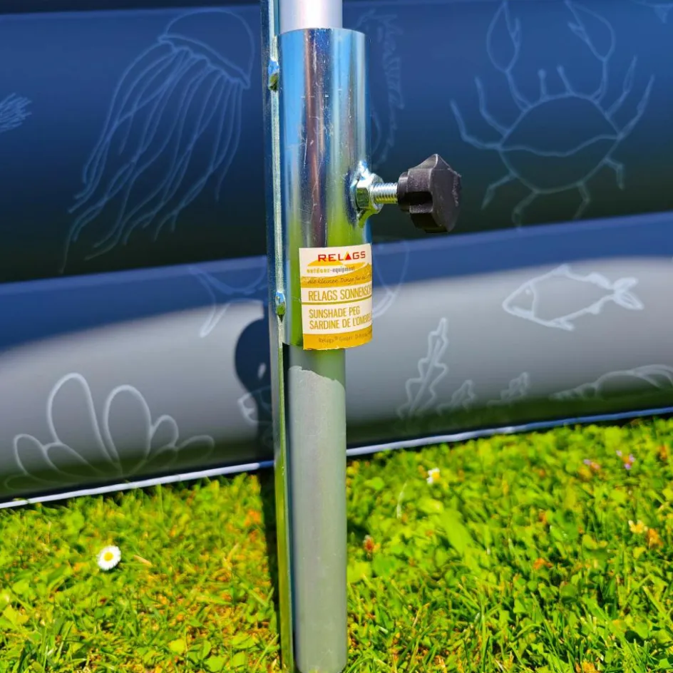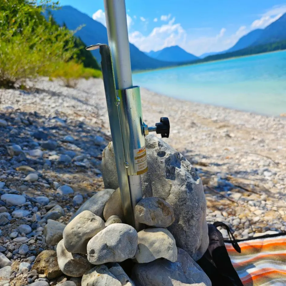 Eine Schraube am Rohr sichert den Schirm, damit er bei einer Windböe nicht aus der Halterung gezogen wird. Zum Transport kann der Hering am Sonnenschirm verbleiben und nimmt damit kaum Platz ein.