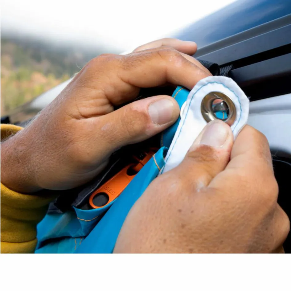 So abgespannt, kann der Universal Fahrzeugadapter mittels Klemmen oder Saugnäpfen (nicht enthalten) an Fahrzeugen ohne Kederschiene montiert werden.