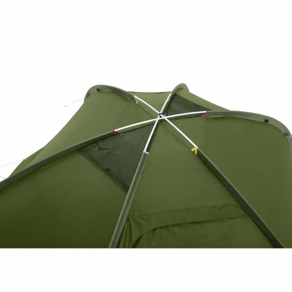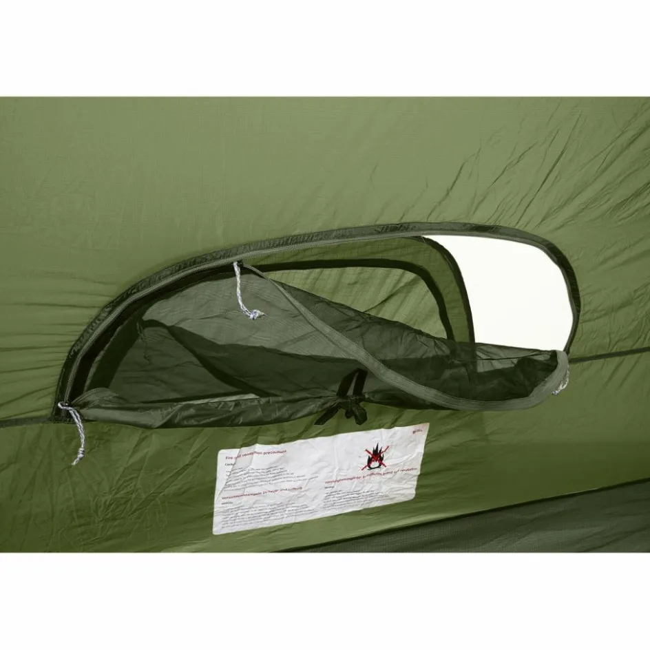 Die Außenzelttüren kannst du halb geöffnet fixieren. Das maximiert die Belüftung, ohne dass Regen ins Innenzelt tropfen kann. Die beiden großen Tieflüfter kannst du aus dem Innenzelt heraus bedienen. Sie sind mit feinem Moskitonetz versehen. Ergänzt werden sie durch zwei Deckenlüfter, für dessen Bedienung du das Zelt ebenfalls nicht verlassen musst. Alle Lüfter können schneesicher verschlossen werden.