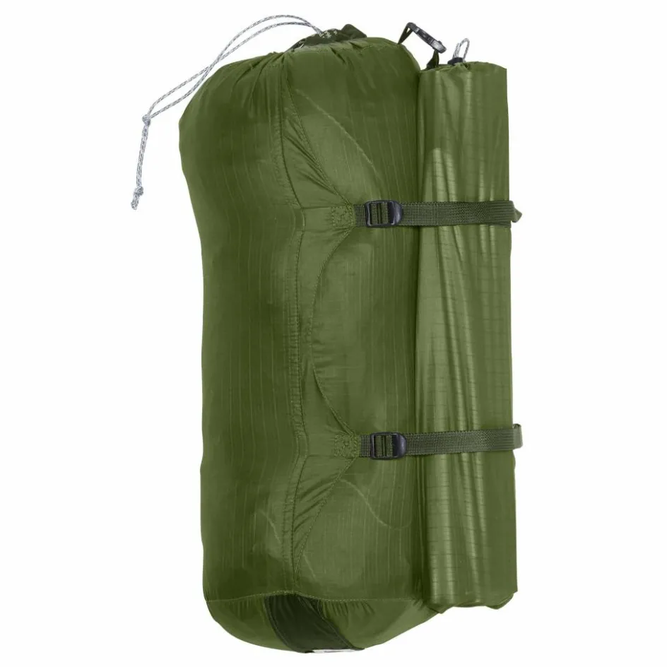 Das Außenmaterial setzt sich aus zwei Gewebestärken zusammen. Das dunklere bodennahe Material besteht aus 40 Denier starkem TripleRip Polyamid, das weniger beanspruchte Obermaterial aus 20 Denier TripleRip Polyamid. So wird hohe Robustheit bei geringem Gewicht erreicht.