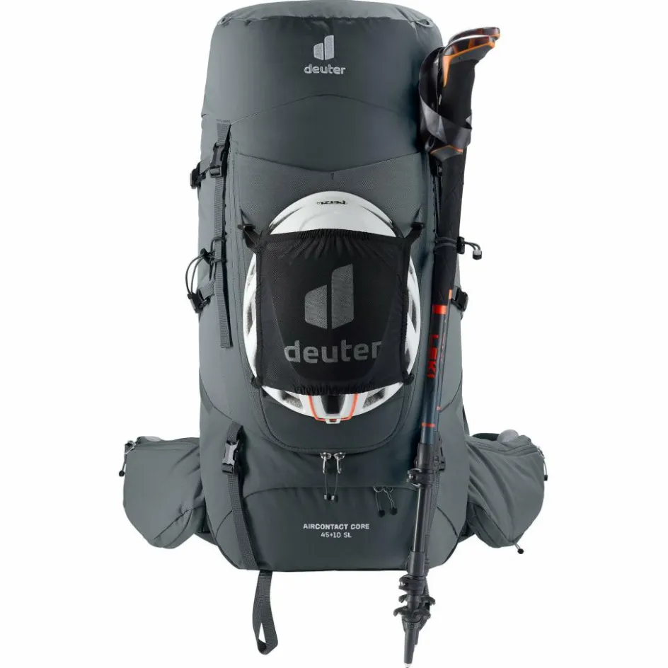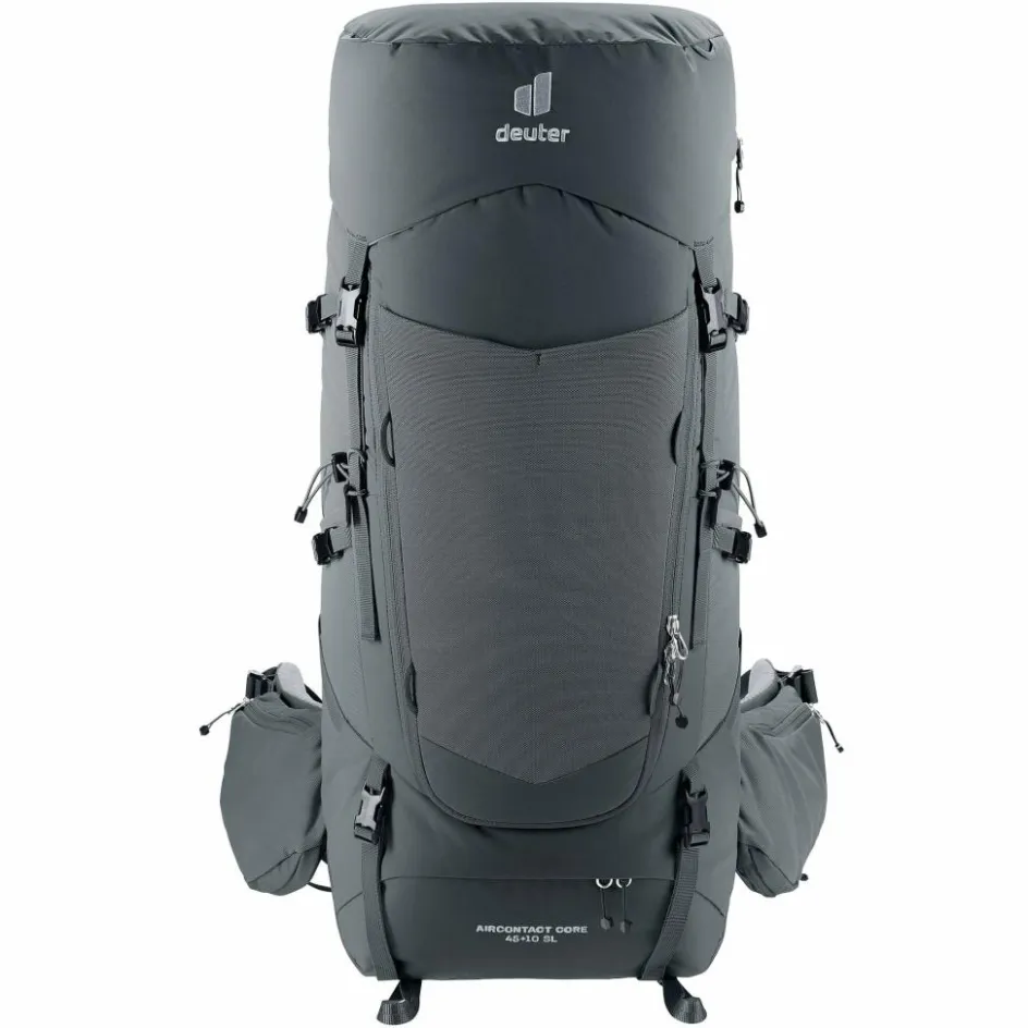 Der Trekkingrucksack wartet mit allen Fächern auf, die du auf Mehrtagestouren brauchst, um deine Ausrüstung übersichtlich und griffbereit zu sortieren. Das Hauptfach lässt sich klassisch von oben und über einen großen Frontzugang öffnen, sodass du jederzeit problemlos an deine komplette Ausrüstung kommst. Dank der Schlaufen auf der Front kannst du Zelt oder Isomatte einfach außen am Rucksack befestigen und so einiges an Platz im Hauptfach sparen. Den Aircontact Core musst du zum Trinken übrigens nicht absetzen: Mithilfe der Flaschenhalterung auf dem rechten Hüftgurt kannst du deinen Durst auch mit geschultertem Rucksack unkompliziert löschen.
