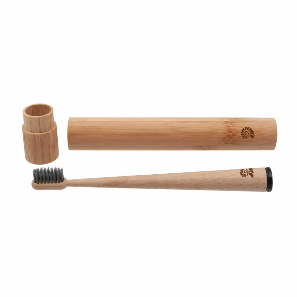Bambuszahnbürste mit Borsten aus Bambus–Viskose. Durch die Kegelform kann die Zahnbürste zum Trocknen aufrecht hingestellt werden. Inkl. Reiseetui aus Bambus.