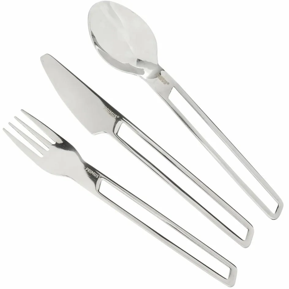 Edles und verhältnismäßig leichtes Besteckset aus 18/8-Edelstahl mit Lederbanderole. Bestehend aus Löffel, Gabel und (Frühstücks-)Messer. Die Griffe sind ausgespart und verringern dadurch das Gewicht.
