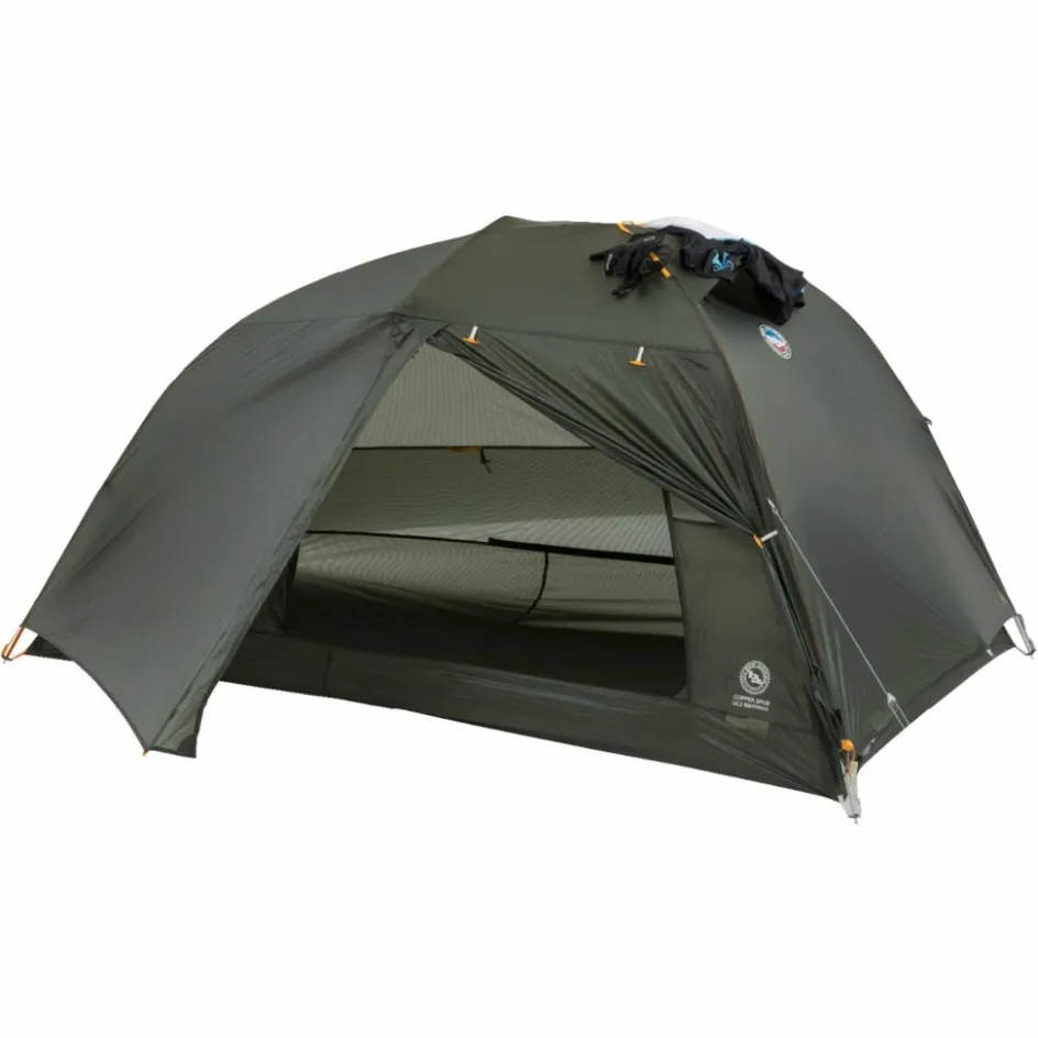 Das von Big Agnes entwickelte Hyperbead-Gewebe ist rund 6 % leichter als vergleichbare Materialien und dabei besonders reißfest. Es bleibt dauerhaft wasserabweisend und kommt ohne PFAS-haltige Imprägnierung aus. Große Mesh-Flächen und ein Hochlüfter sorgen für gutes Klima im Innenzelt, während die fast senkrechten Wände eine komfortable Sitzhöhe bieten. Der Eingang lässt sich komplett öffnen und ermöglicht einen 180°-Panoramablick.
