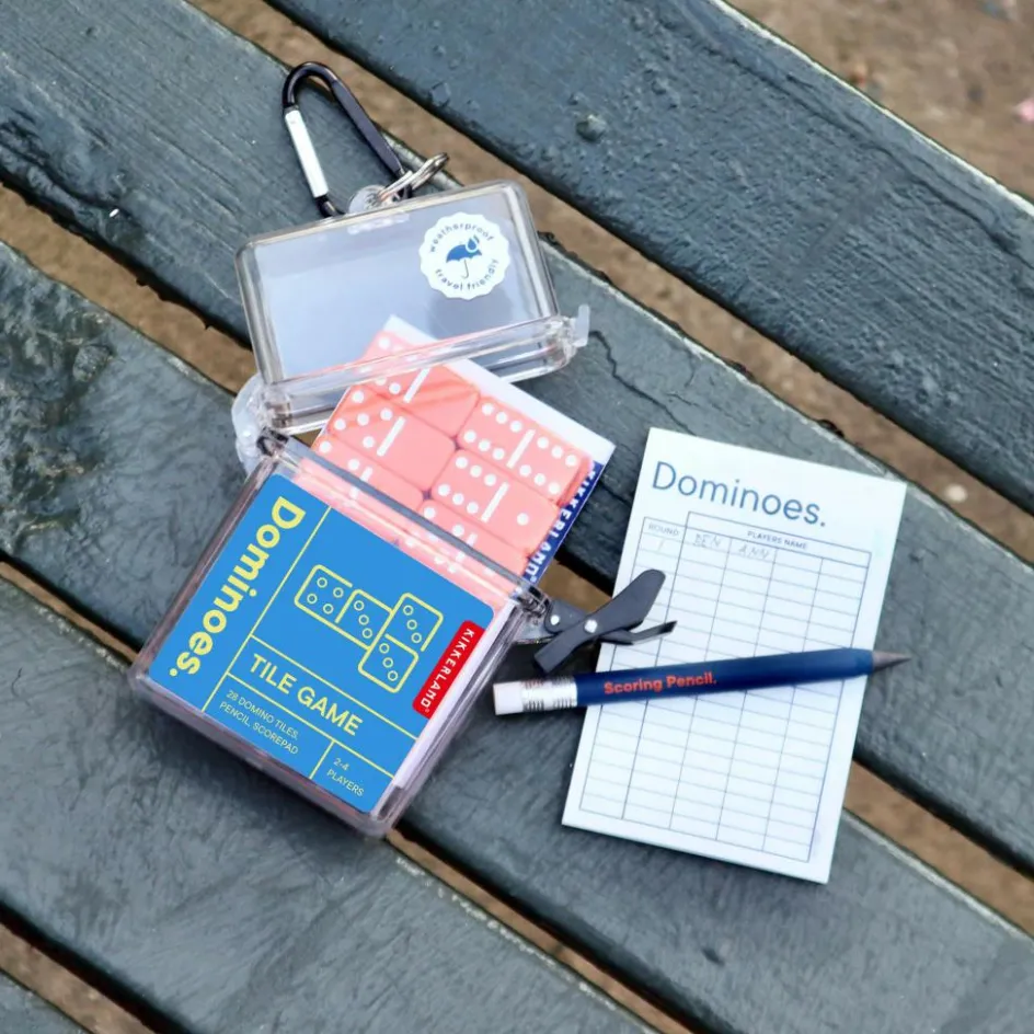Domino für unterwegs: Ob vorm Zelt oder in der Bahn, mit den Dominoes ist immer eine Partie möglich. Praktisch: Alle Utensilien fürs Spiel kommen in einer wasserdichten Box mit Karabiner.