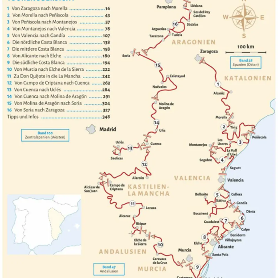 Auf 16 abwechslungsreichen Touren entdecken wir den Osten Zentralspaniens. Wir führen Sie zu Kultur- und Natur-Highlights wie in die ehemaligen Königsstädte oder durch einsame Halbwüstenregionen. Wir laden Sie außerdem ein zu erfrischenden Bade aufenthalten an der quirligen Mittelmeerküste und in glas klaren Naturpools.