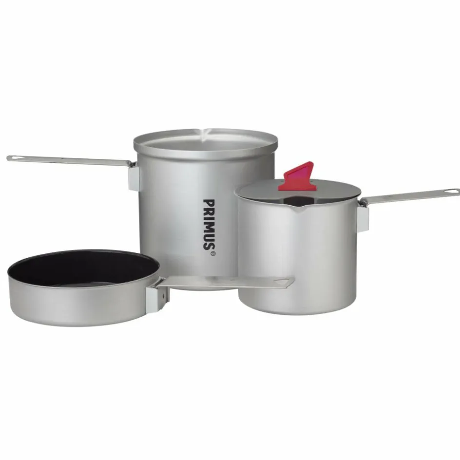 Kleines Kochset für eine Person. Bestehend aus zwei Töpfen mit 0,6 l und 1 Liter Volumen, Pfanne und Deckel mit integriertem Sieb. Die Griffe können zum Transport platzsparend verstaut werden.