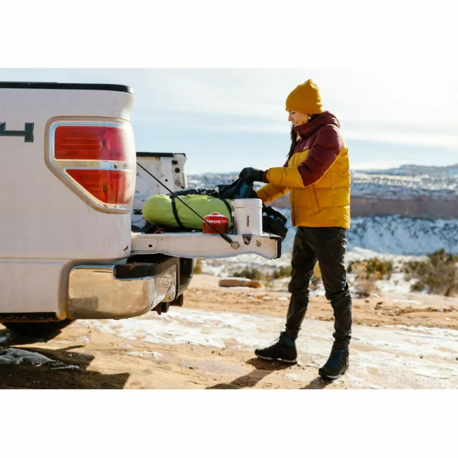 Für den Transport fixierst du die Pfanne mithilfe des Griffs am Topf. In diesem ist ausreichend Platz für eine 230 g Gaskartusche und einen kleinen Gaskocher.