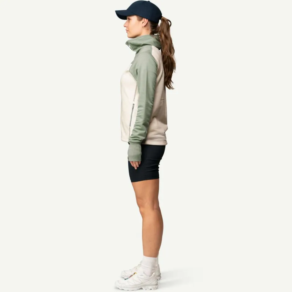 Das Außenmaterial der Jacke besteht aus einem Mix aus Merinowolle und Polyamid. Durch die Kunstfaser ist das Gewebe widerstandsfähiger, was beim Tragen eines Rucksacks von Vorteil ist. Zudem wurde die Außenseite mit Aquaduct behandelt. Aquaduct ist eine stark feuchtigkeitsleitende Ausrüstung, die eine ähnliche Wirkung wie ein absorbierender Docht hat. Dadurch kann entstehende Körperfeuchtigkeit noch schneller nach außen transportiert werden.