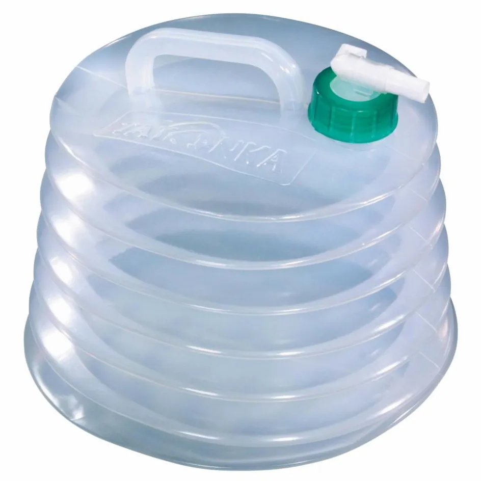 Kleiner Faltkanister, den du auf ein minimales Packmaß zusammendrücken kannst. Mit 10 l Füllvolumen, Abfüllhahn und Tragegriff.